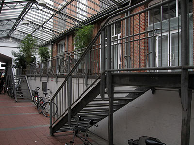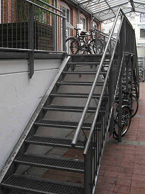 Aber sind da nicht links an den Treppen so Metallschienen, auf denen man hochrollen kann? (Ich mein, immerhin! ;-))