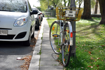 Hier macht mir das böse Fahrrad eine Beule in mein Auto.