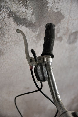 Die Bremsanlage führt ein wenig in die Irre: der Handgriff betätigt nämlich in Wirklichkeit den Fuß, der zum Boden geht.