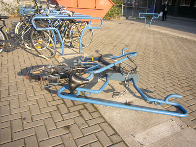 Der Platz am Bahnhof wird demnächst umgestaltet. Arbeiter entfernten schonmal die Muttern der Radständer, damit es schneller geht.